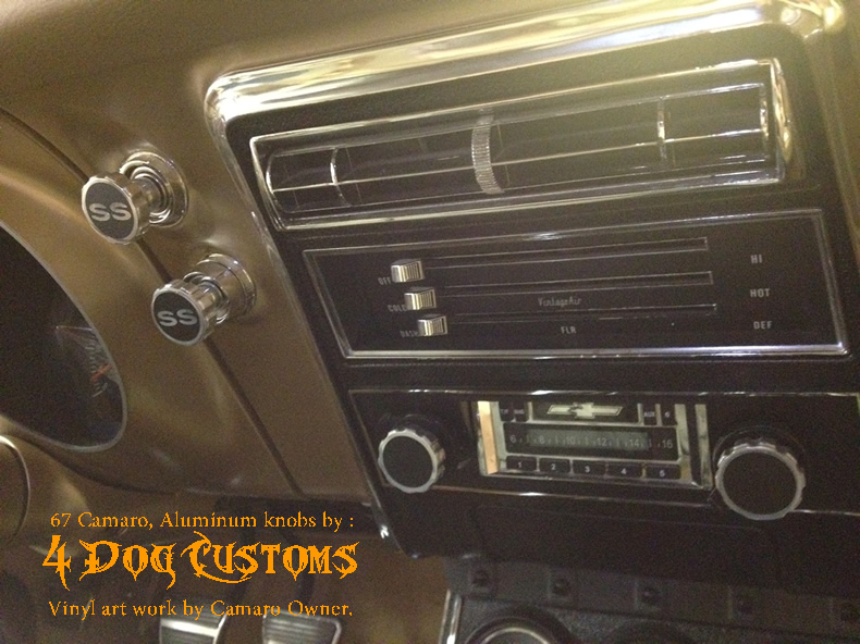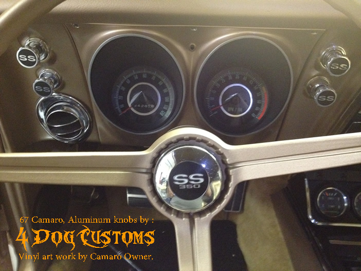 | Custom interior aluminum accesory knobs - Aluminum work by 4 Dog C, vinyl was customers own creation. He did a heck of job with the decal work! Notice the knob with the key! Tool markings where left to give it a more visual effect. |