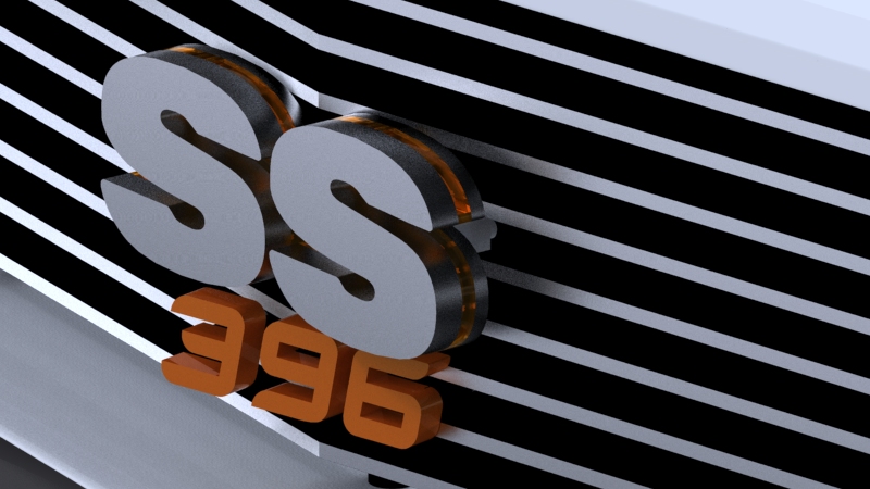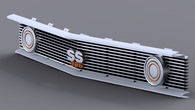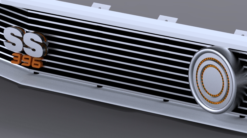Concept of 67 Camaro aluminum grill with custom turn signals, custom lighted silhouetted SS badge and billet 396 numbers.